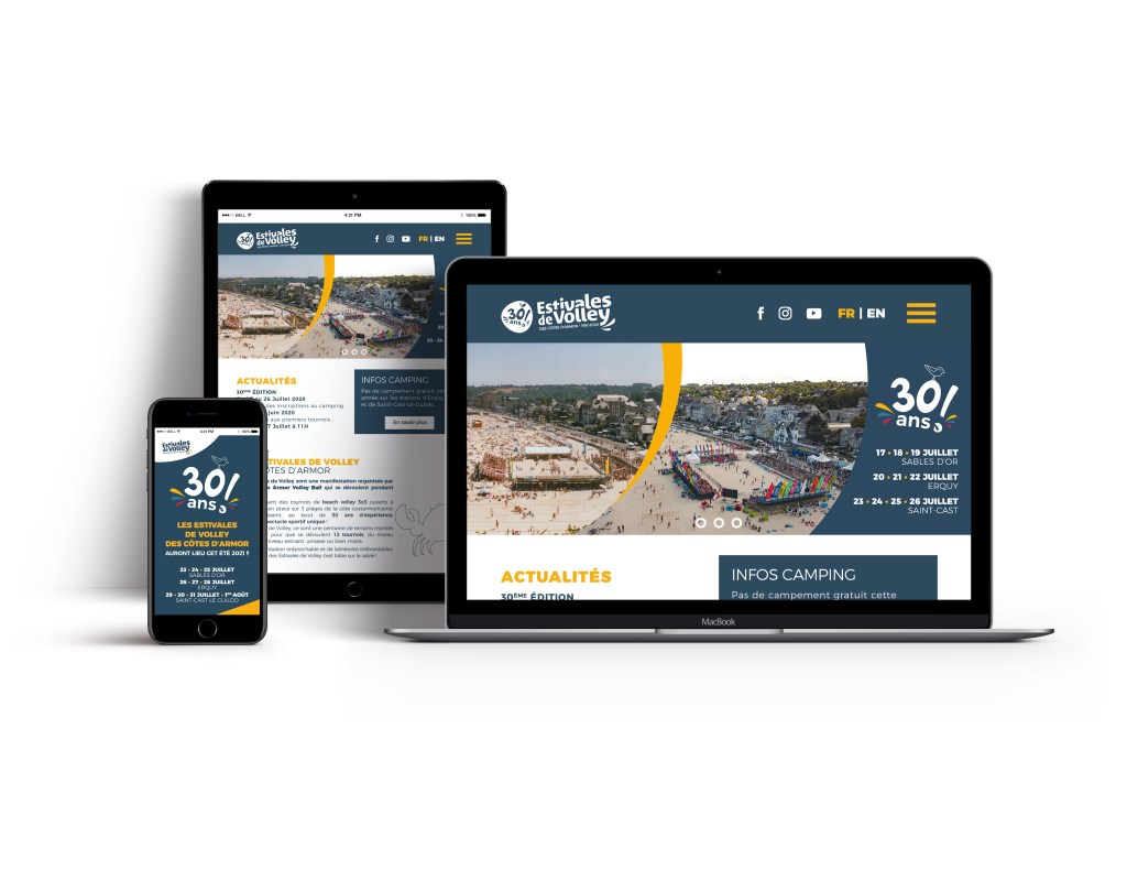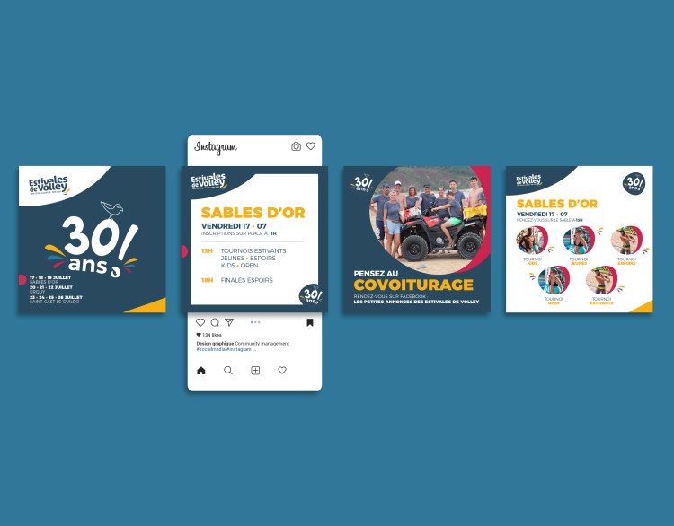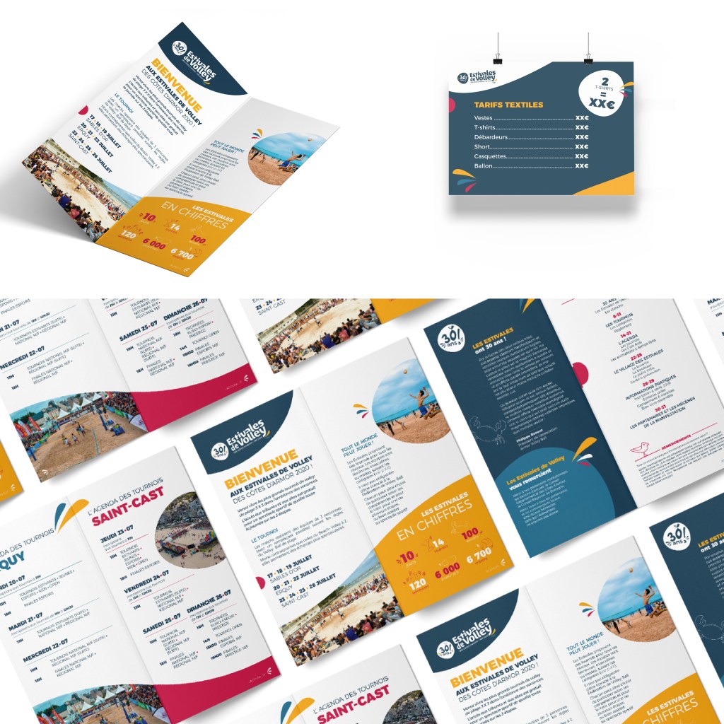 Concernant les couleurs choisies : les Estivales de Volley sont une manifestation de bord de mer, il est impensable de ne pas symboliser la présence de la mer dans le visuel.