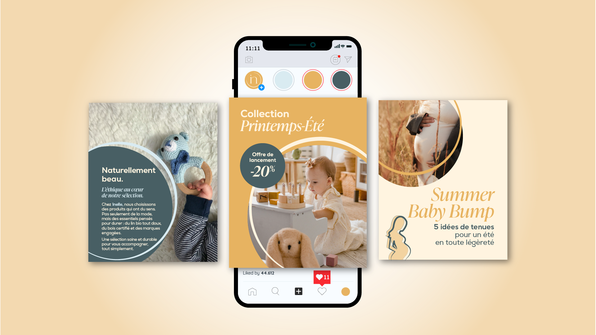 Architecture typographique : J’ai conçu un logotype basé sur un jeu de ligatures symboliques. Le lien organique entre le « i » et le « n » suggère la courbe de la maternité et la transmission, sans tomber dans l’illustration littérale.